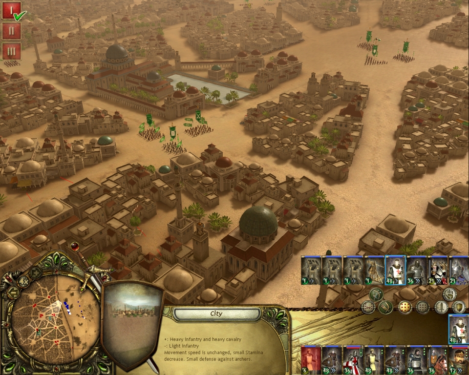 A csaták szüneteiben nem a szokásos nyomorkezelő rutin van, értsd itt nincs provinciális gazdálkodás, nyavalygó jobbágyok, csak és kizárólag a haderőt kell foltozni. Dukátok formájában jutalmaznak egy-egy szétvert sereget, de a velencei kalmárok kamattal terhelt hiteleire is támaszkodhatunk, plusz a megszerzett keresztény relikviák, mint mondjuk az igazi kereszt (amelyen Jézust megfeszítették) egy darabjáért is jókora summát fizetnek – ezek lesznek a bevételeink. A kiadások pedig javarészt a játékos képességeitől függnek, mert egy sok vérrel kivívott győzelem után az egységek feltöltése gyakorlatilag elviszi a teljes hasznot, bár itt jegyzem meg, hogy a fejlesztők okosan nyitottak egy kiskaput az egységek pihentetési lehetőségével. Amúgy ha dúskálnánk a javakban (amire amúgy tényleg csekély az esély), akkor sem vehetünk kilóra keresztes lovagokat, egyrészt irgalmatlanul drágák, másrészt a jobb egységeket a durvább csaták vagy valamely frakcióhoz fűződő viszonyunk feltornászása után teszik ki az eladási tablóra.