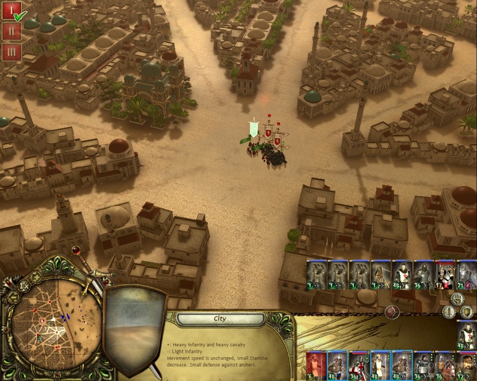 A Neocore-nak az Arthurnál már hellyet szorítottam a szívemben a jobb pitvar mellett, de úgy tűnik, előkelőbb helyet kell keresnem, mert amit egységfejlesztés címén kapunk, az valami gyönyörűség. Minden megvásárolt egység 5 fejleszthető alaptulajdonsággal rendelkezik, és 12 szintet léphet, továbbá 3 szintenként felvehet egy speciális tulajdonságot, mint mondjuk a lovasságnál az expert riding (a terep negatív hatásainak huss). Eddig ebben semmi szokatlan nincs, no de az egységek mindegyike harcban is elnyerhet képességeket, illetve pénzzel is trenírozható a támadó és védekező értéke. Továbbá minden kompánia 3 extra dolgot viselhet, nevezetesen egyedi páncélt, fegyvert és egy flaska tápoldatot (ez lehet sebzésnövelő vagy kitartásösztönző lötyi stb.), utóbbiak szaracén hullákból és térképen ácsingózó kalmárokból hullanak. És még nincs vége, kapitányokat állíthatsz a csapatok élére, papokat, akik a morált erősítik, vagy gyógyítókat, amivel a veszteségek csökkenthetők. Mindez egyszerű, logikus keretbe lett foglalva, és az egészet szó szerint megkoronázza az Oroszlánszívű. A sereg vezére ugyanis a keresztény relikviák legfőbb hordozója – azért csak a legfőbb, mert később más hősök is beléphetnek a seregbe. A relikviák – nem kevés van, mondhatni a legutolsó katolikus szent cipőgombja is fellelhető – bónusza pedig a Hit (vallás) pontokkal szorzódik fel, utóbbiakat meg a mellékküldetésekben (térképen ácsorgó figurák) megjelölt szöveges válaszaink után vagy az anyaszentegyháznak lepasszolt kegytárgyakért osztogatják.