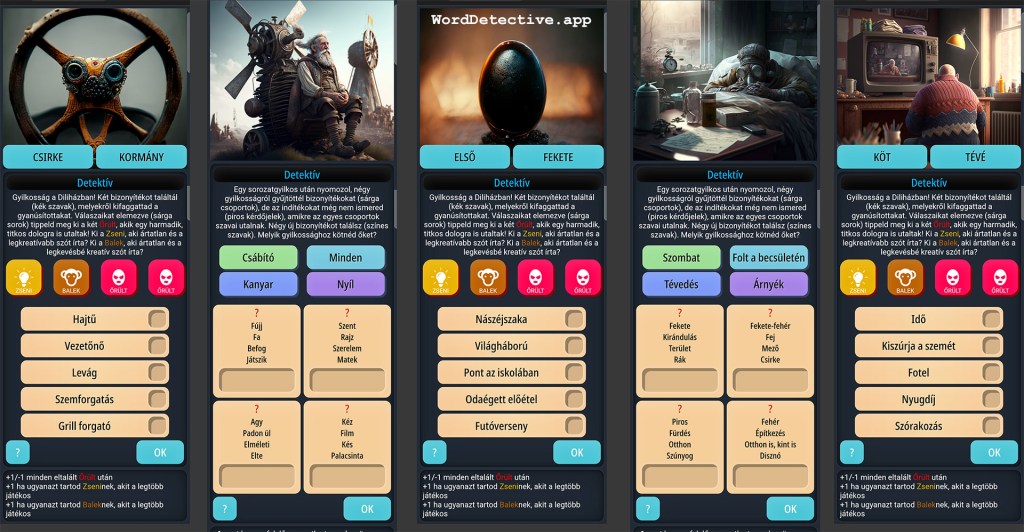 A mi játékunk arra az ötletre épül, hogy minden kiagyalt asszociáció egy-egy gyilkos karakterben ölt testet. A karakterek létrehozásával párhuzamosan a játékosok nyomozó módban is játszanak, a többi játékos gyilkosait próbálják lefülelni. Ha egy karaktered frappáns, az gyűjti neked a pontokat. Ha pedig lebukós, előbb-utóbb elfogy az életereje és meghal. A játék hangulatát AI által generált képek dobják fel, amik rejtett utalásokkal segítenek. Mivel a játékban valódi játékos-érdekek feszülnek egymásnak, ezért jó pontszámot elérni meglehetősen nehéz, de azt gondolom, pont ez a kihívás teszi érdekessé.