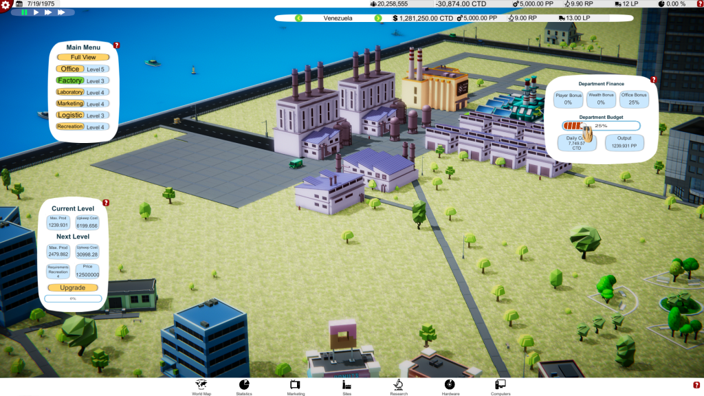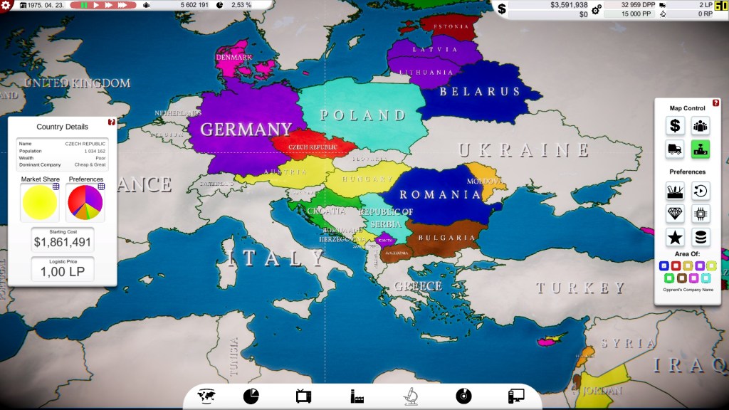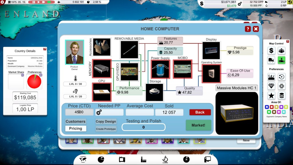 Viszont a játéknak valóban van piaci szimulációja, méghozzá elég összetett. Ez azoknak nagyon tetszik, akik szeretik a “spreadsheet simulator”-okat, kevéssé azoknak, akiket csak a számítógép tervezés érdekel. Igyekszem megtalálni a megfelelő egyensúlyt a kettő között. Foglalkoztam vele, hogy körülbelül hány számítógépet gyártottak és adtak el adott években a valóságban, hogyan aránylik a marketing és a gyártási költség stb. stb. és igyekeztem ezeket nagyságrendileg jól belőni a játékban, de csak amennyire ez nem zavarja magát a játékélményt (ami a legtöbb játékos számára piackutatást, kutatást, erőforrás management-et, számítógép tervezést és a világtérképen való terjeszkedést jelenti jelenleg).