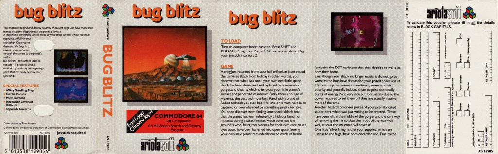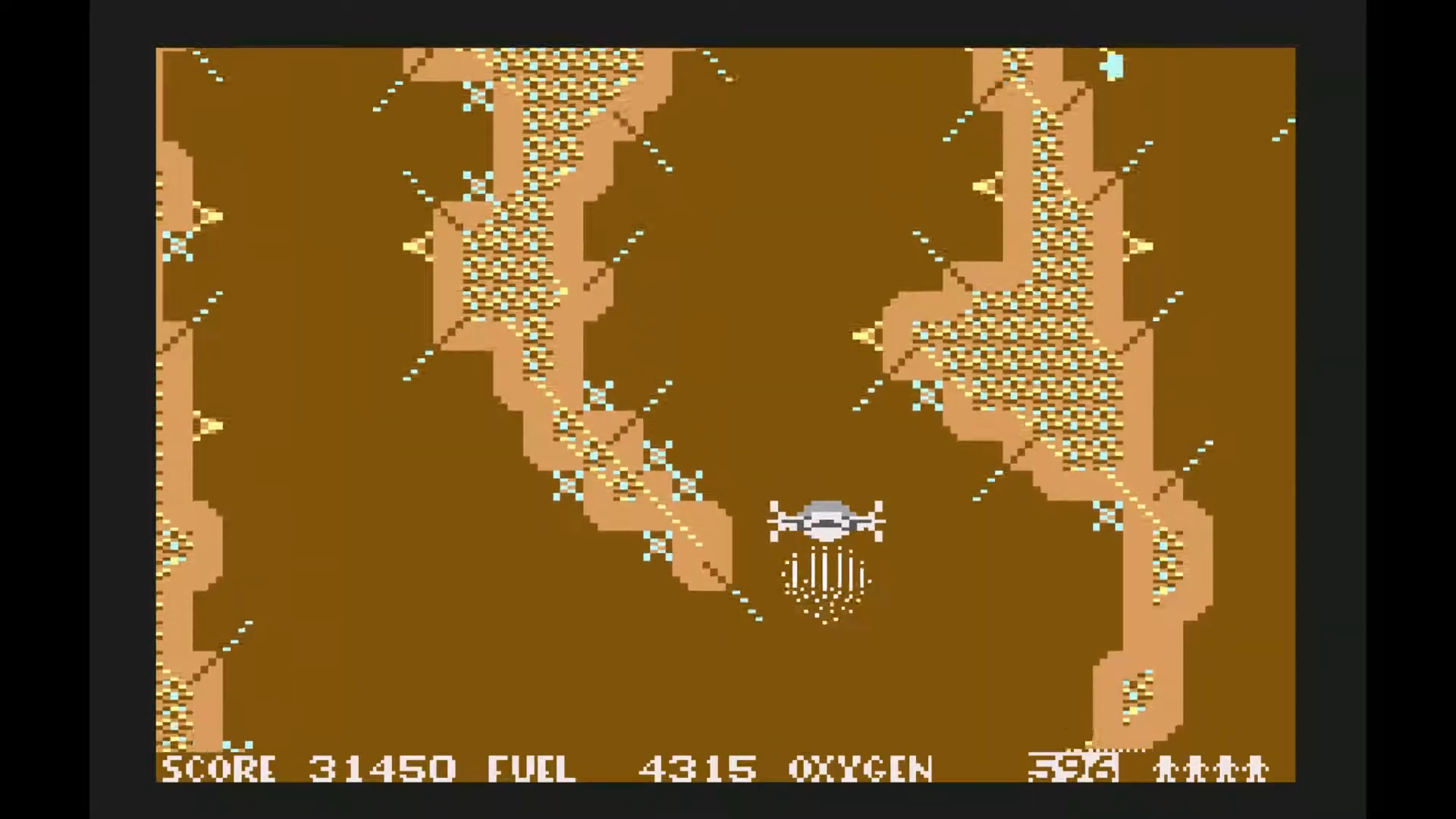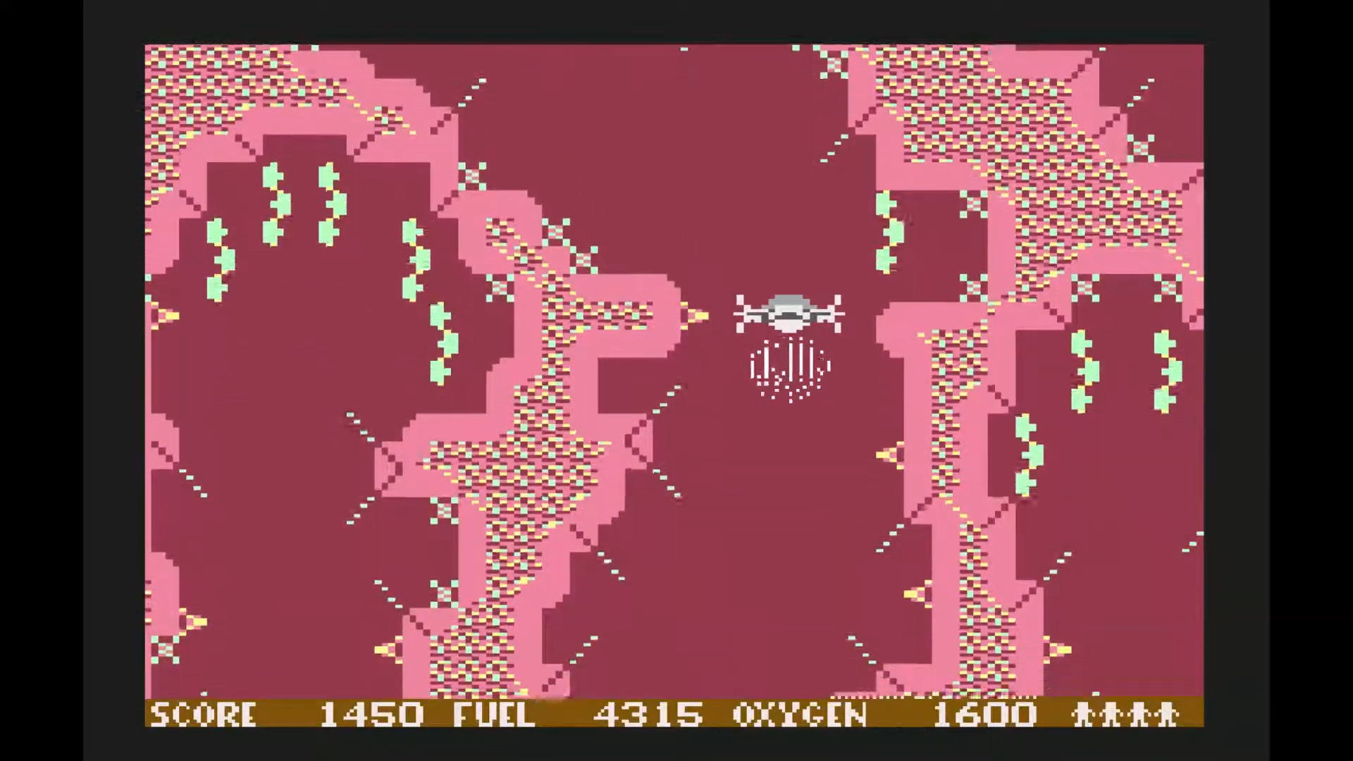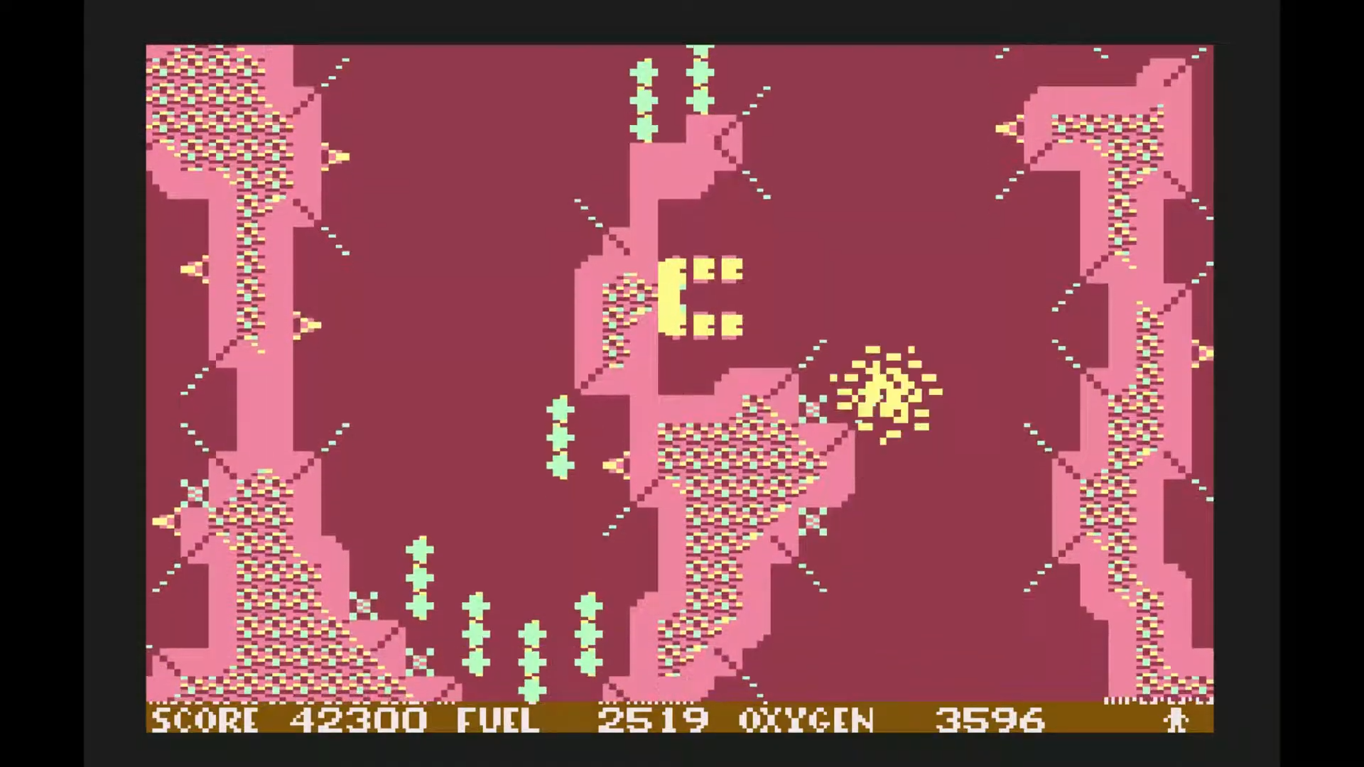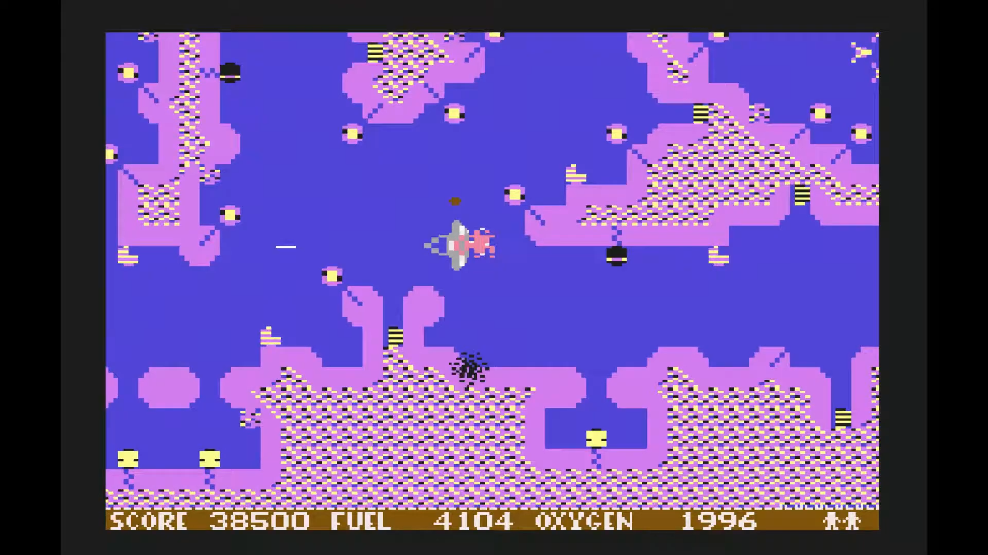 c64.krissz: Egy lila-kék labirintusban kell precízen röpködni az űrhajónkkal. Arra kell törekedni, hogy minél több benzines (fekete bogyó) és oxigénes (sárga bogyó) tartályt lőjünk ki, miközben a lézerkapukat és az ütközéseket elkerüljük.