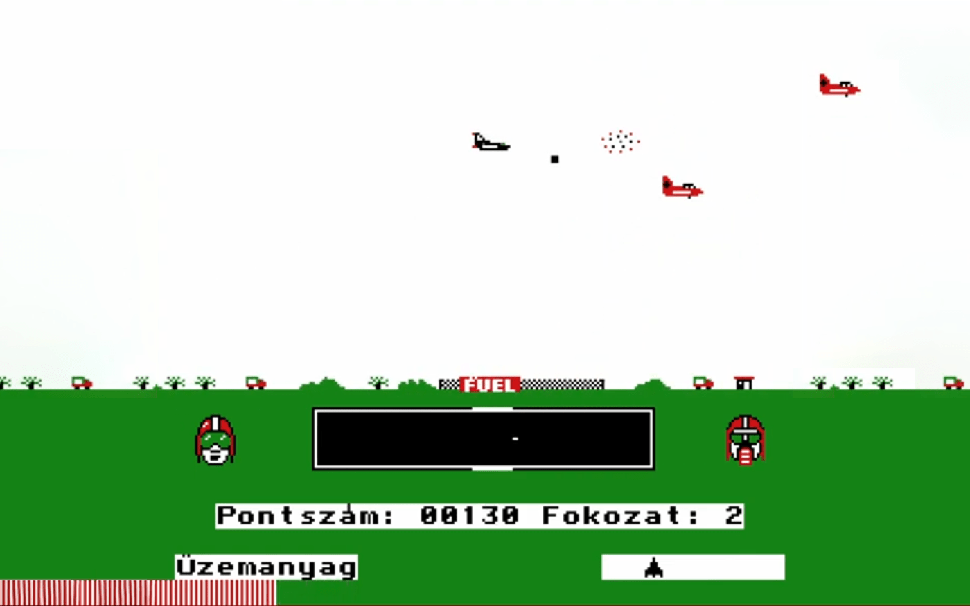 A radarernyőn feltűnik az ellenséges repülőraj. Késlekedésre nincs idő: indítsuk a vadászgépet, szálljunk fel vele, és próbáljuk megsemmisíteni a behatolókat. Közben arra is vigyáznunk kell, nehogy az ellenség bombái gépünket eltalálják. Ha az üzemanyag fogyóban van, le kell szállni és feltölteni a tartályokat, különben lezuhanunk. [Nem túl bonyolult történet, de hát ez nem egy szimulátor vagy szerepjáték. Viszont most vettem csak észre, ahogy másoltam át a szöveget, hogy Beszeda Tamás neve ismét feltűnik a borítón. Az ő nevével találkozhattunk a Ladderman, de még a Kísértetkastély kapcsán is. Úgy tűnik ő valamiféle Novotrade-es minőségellenőr/szerkesztő lehetett, aki gondolom belenyúlt a programokba itt-ott kijavítani valamit. Vagy beleírta, hogy ez Novotrade játék… De persze meglehet, hogy tévedek, aki tudja, ki volt ő és mit csinált, nyugodtan írja meg hozzászólásként.